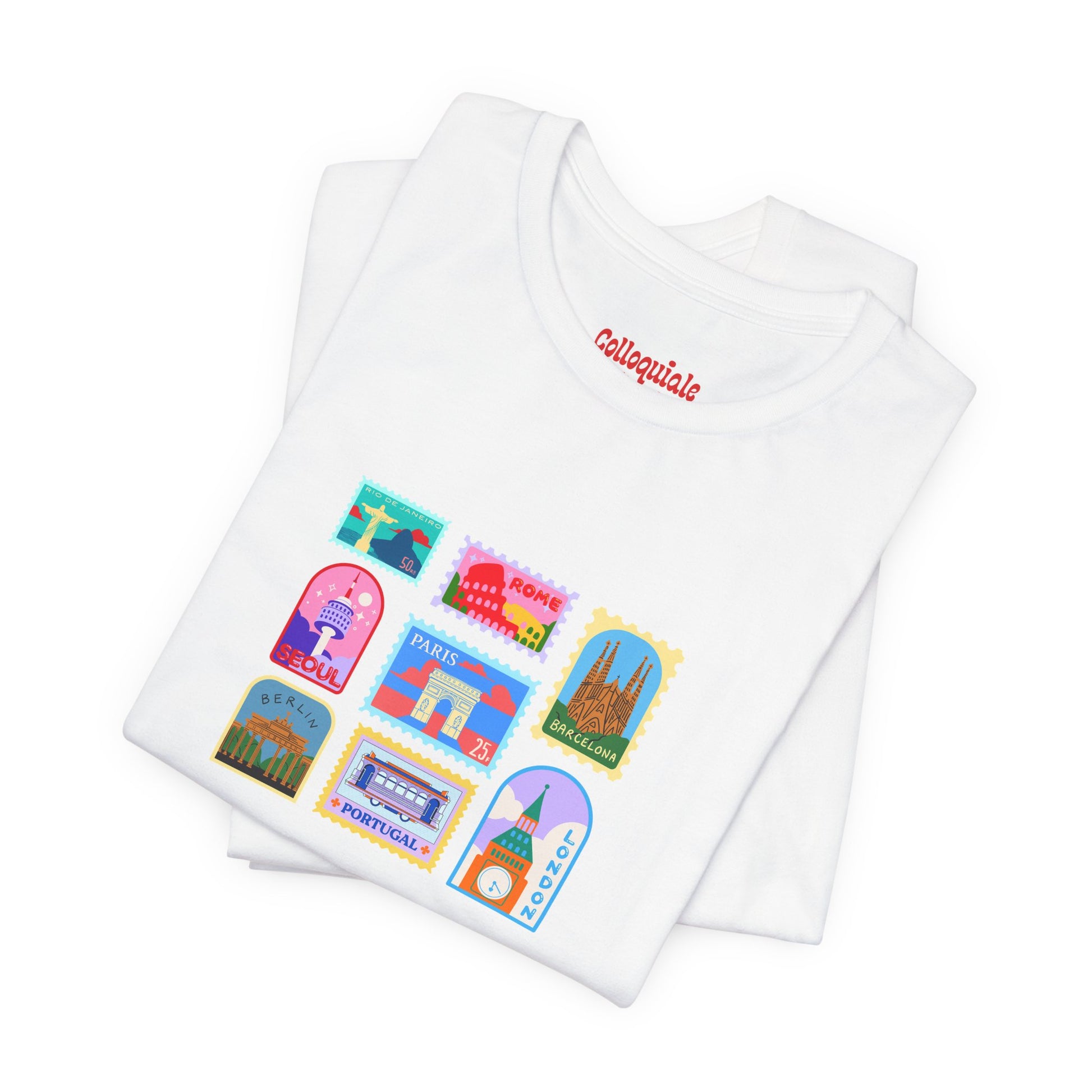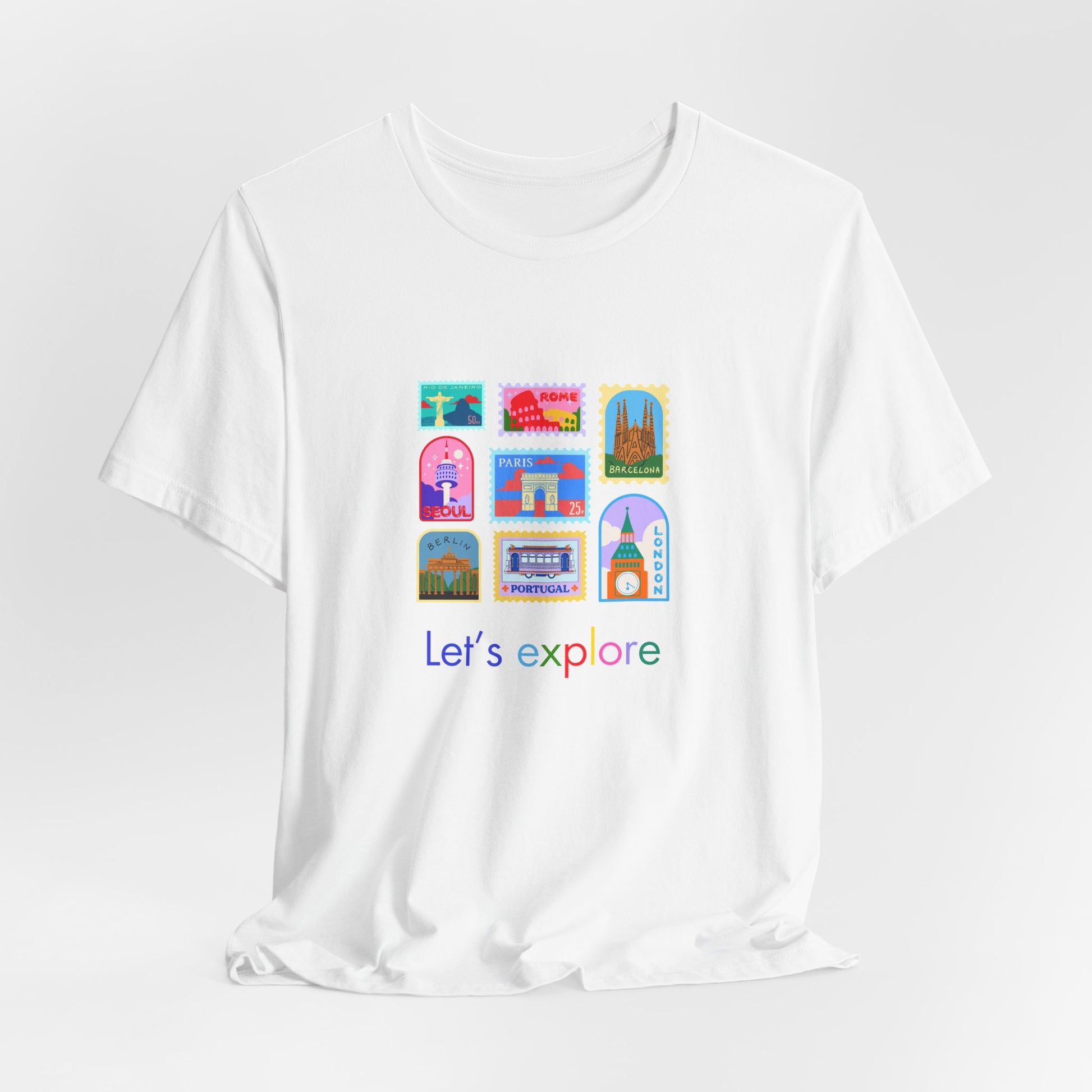 Ready to explore? Our Let’s Explore tee showcases a colorful graphic of passport stamps from around the globe. Perfect for those who love to discover new places, this vibrant design adds a playful touch to your wardrobe while keeping you comfortable on all your adventures.